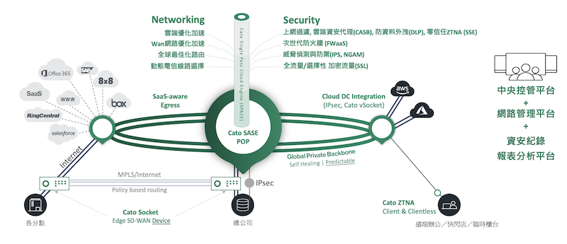 Cato SASE Cloud 是一個融合的雲原生單通道平台,在安全的全球服務中連接端到端企業網絡資源(包括分支機構位置、雲和物理數據中心以及混合勞動力)。Cato 的全球專用主幹網利用由 80 多個 PoP 組成的全球 SLA 支持網絡,包括 WAN 優化並具有自我修復功能。根據現有案例研究,使用 Cato SASE Cloud 的客戶在相同的網絡支出下提高了網絡可用性、容量、性能和安全性。