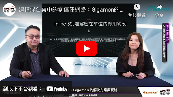Gigamon 可消除現代混合雲端基礎架構中最大的盲點:隱藏在加密通訊中的威脅行為者橫向活動。透過本次演講,您將了解如何利用 SSL 技術和 Gigamon 的解決方案來建構安全可靠的零信任網路,協助您的企業在混合雲環境中實現最佳的網路安全保護。
