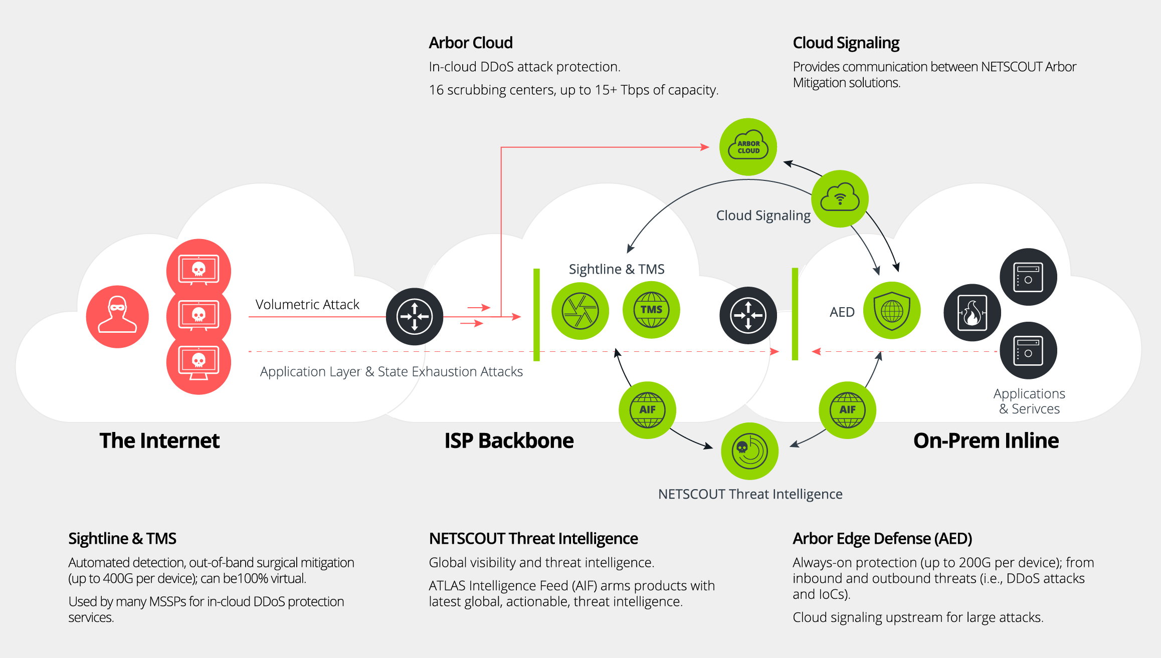 NETSCOUT DDoS 解決方案,結合了AI/ML分析系統及全球自建情資搜集分析系統,自動識別和消除針對企業和電信業者的所有類型的 DDoS 攻擊。可快速偵測和抵禦威脅,並清洗不斷升級的網路威脅強度和複雜性,確保企業始終受到保護,免受不斷演變的網路威脅。