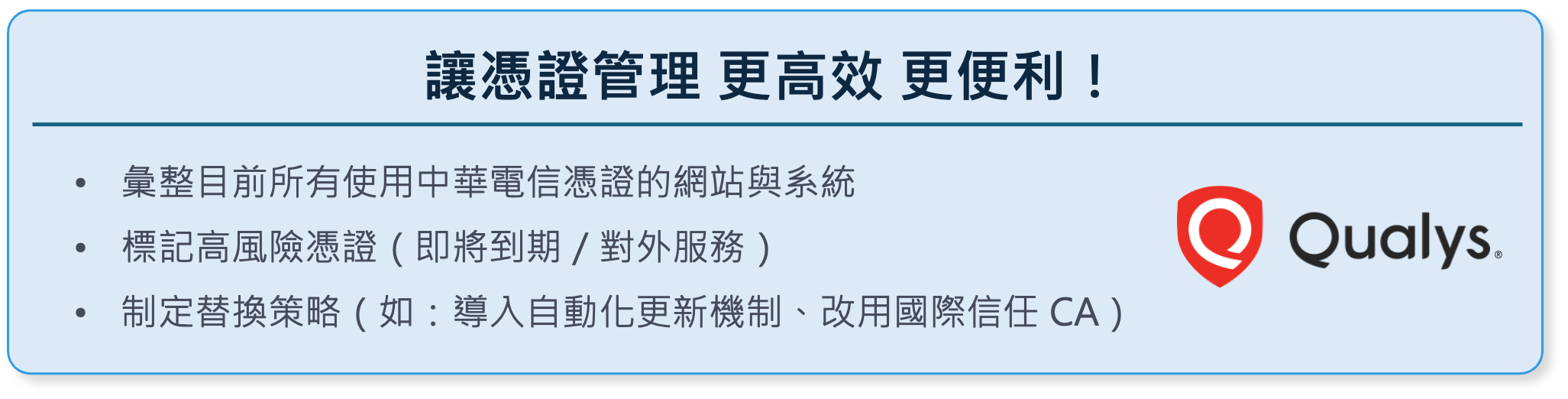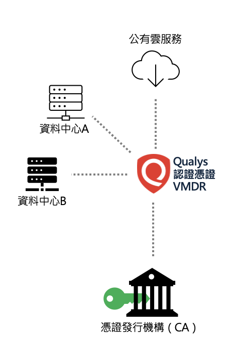 Qualys 認證憑證弱點管理、偵測與回應(VMDR)可協助企業自動盤點內外部所有憑證資產,並提供即時狀態監控、風險告警與更新管理,避免憑證過期成為營運與信任的漏洞。 |