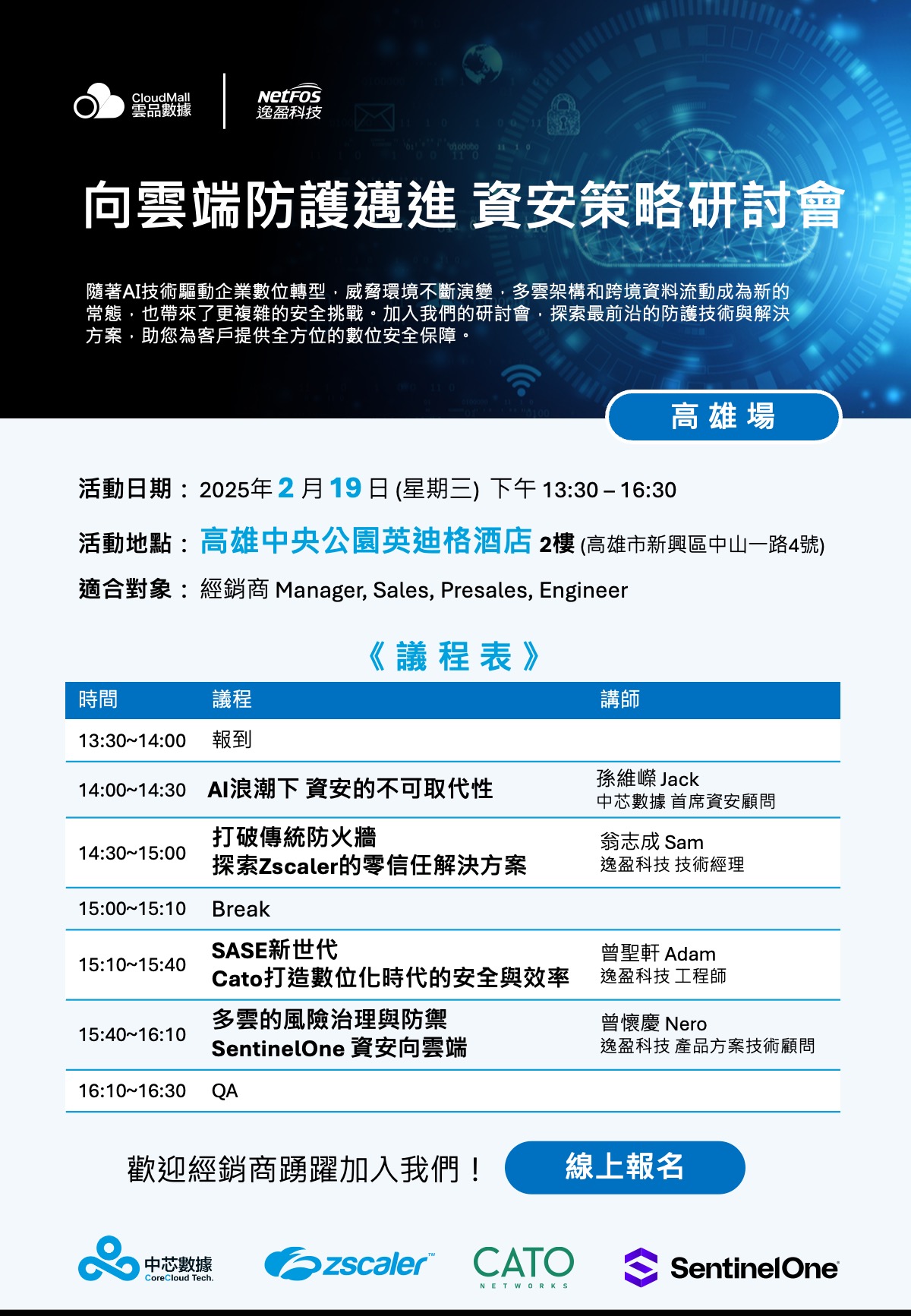 2/19 - 雲品數據 - 高雄經銷商會研討會 |中芯數據, Zscaler, Cato, SentinelOne