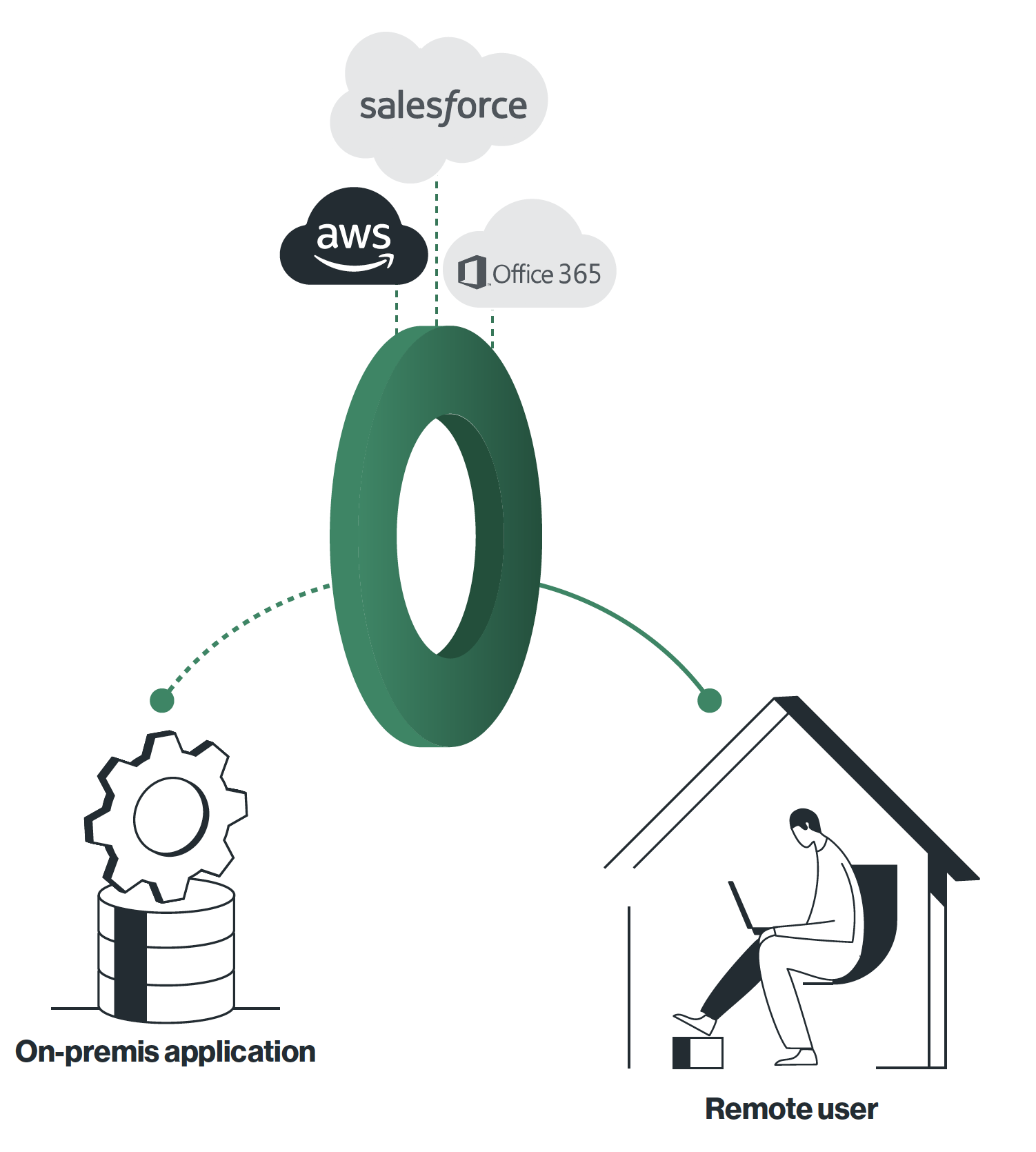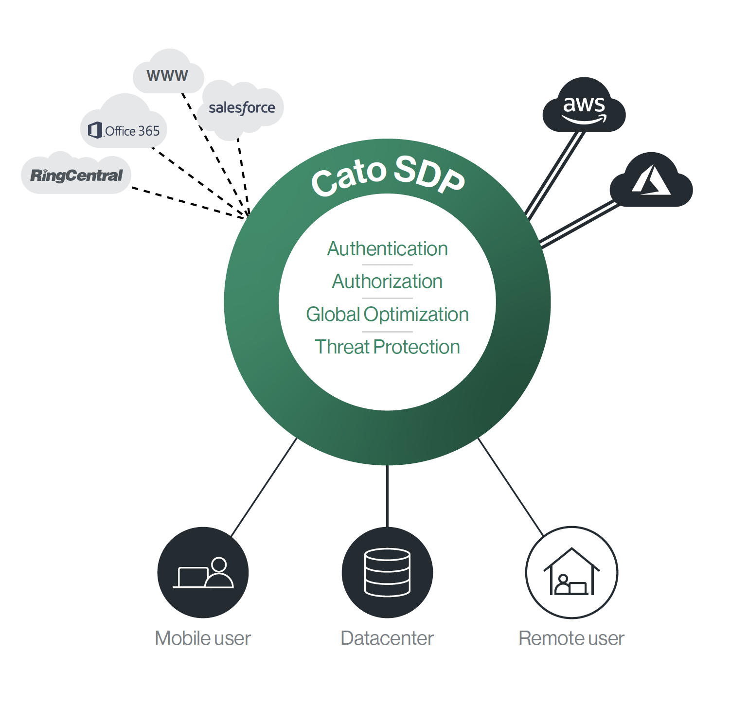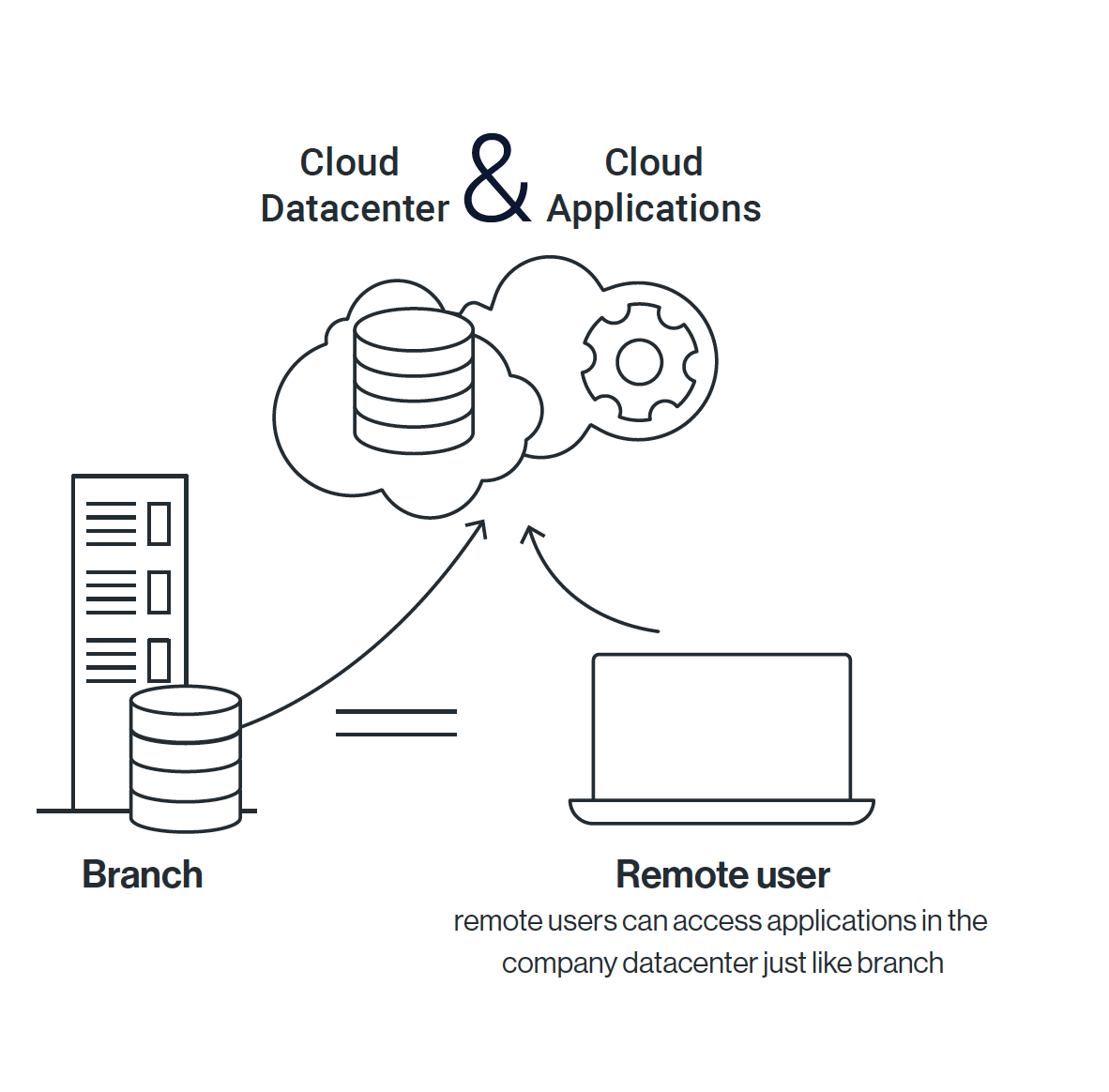 連線至雲端應用程式(SaaS)帶來了更多細微差別。雲端應用不受IT控制,因此遠端連線的使用者的安全問題及網路存取效能問題將是一個巨大的挑戰,因此企業將面臨艱難的選擇:將移動使用者使用者網路流量集中至企業總部,採取集中管理方式的網路管理方式,此種方式的好處是,企業管理者只需要在總公司部署相關的網路優化設備及資安設備,但此種方式所遭遇到的問題是,分點及使用者存取的地點距離問題、網際網路品質及延遲問題都將造成使用者體驗低落,而且對於移動用戶的安全問題完全沒有解決方案,使用者的最終防線只剩下防毒軟體。