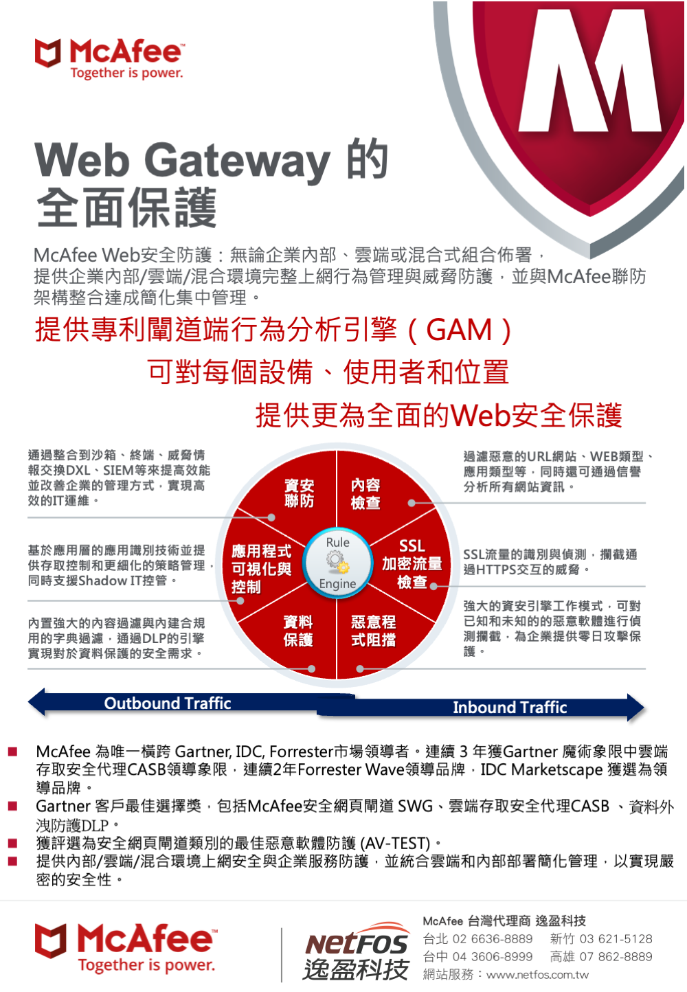 McAfee Web安全防護:無論企業內部、雲端或混合式組合佈署,提供企業內部/雲端/混合環境完整上網行為管理與威脅防護,並與McAfee聯防架構整合達成簡化集中管理。