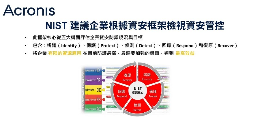 鑑於全球企業面臨日益嚴峻的資安威脅,長期關注全球資安現況與趨勢的NIST(National Institute of Standards and Technology,美國國家標準暨技術研究院), 建議企業應該根據資安框架的核心,即辨識( Identify )、保護( Protect )、偵測( Detect )、回應( Respond )和復原 ( Recover )等五大面向,評估企業的資安防禦現況與目標,並將有限的資源應放在防護最弱、最需要加強的構面,進而發揮最高效益。而深受企業喜愛的Acronis Cyber Protect Cloud,正是市面上少數符合NIST建議的超融合多層次防護架構。