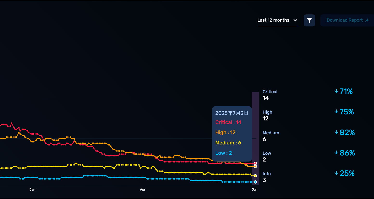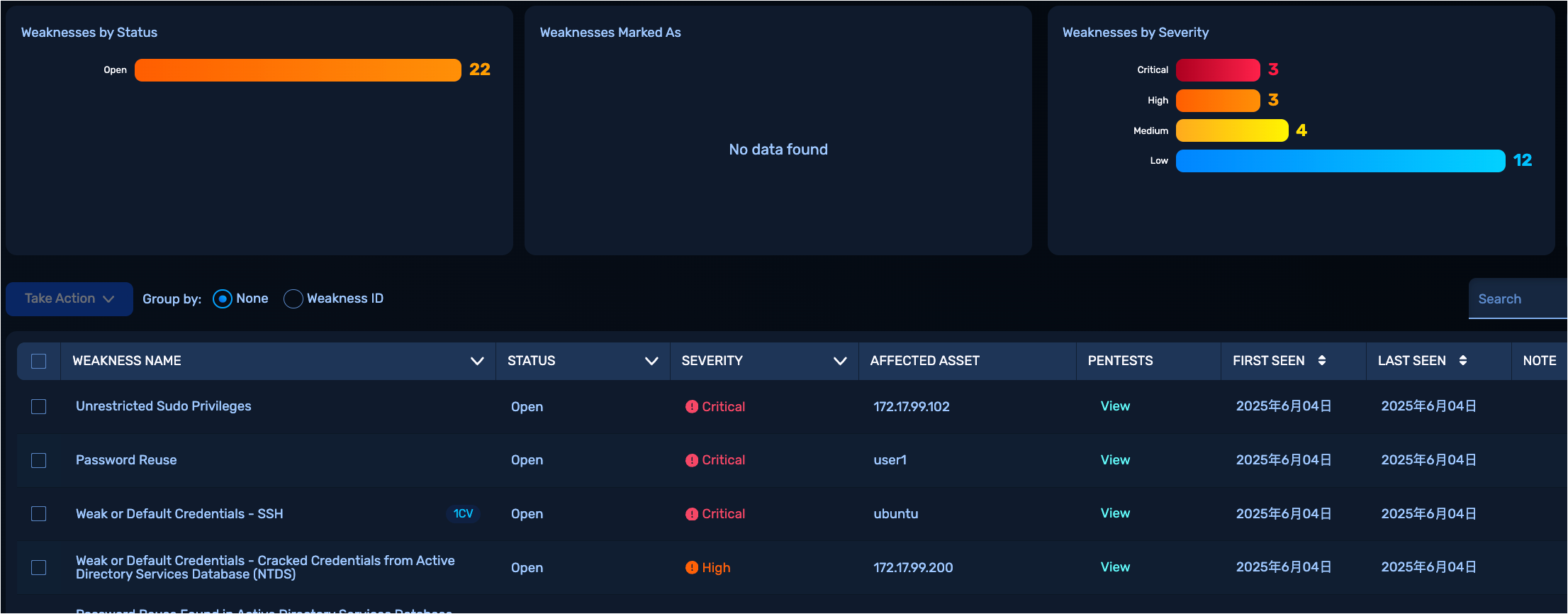 可視化決策儀表板,將所有攻擊模擬結果、資產暴露面與修補狀態整合於單一畫面。協助資安團隊追蹤風險變化、聚焦可利用的風險,並即時驗證修補成效。